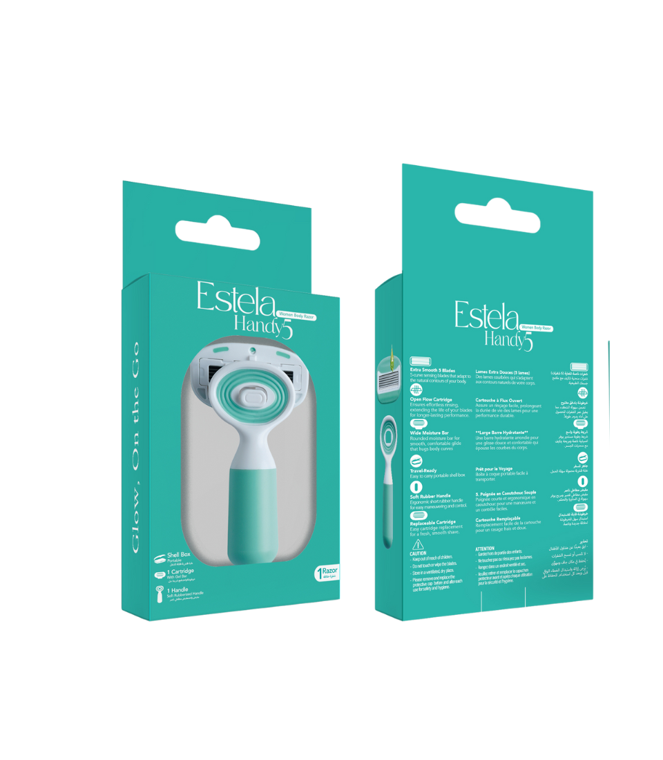 Introducing the Estela Handy5 razor, designed for the modern traveler with its portable capsule casing and open back cartridge for easy rinsing. The full rubberized handle ensures a secure grip, while the moisturizing bar leaves your skin smooth and hydrated.